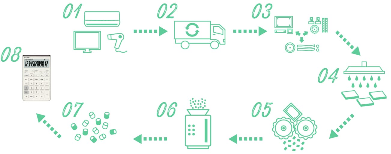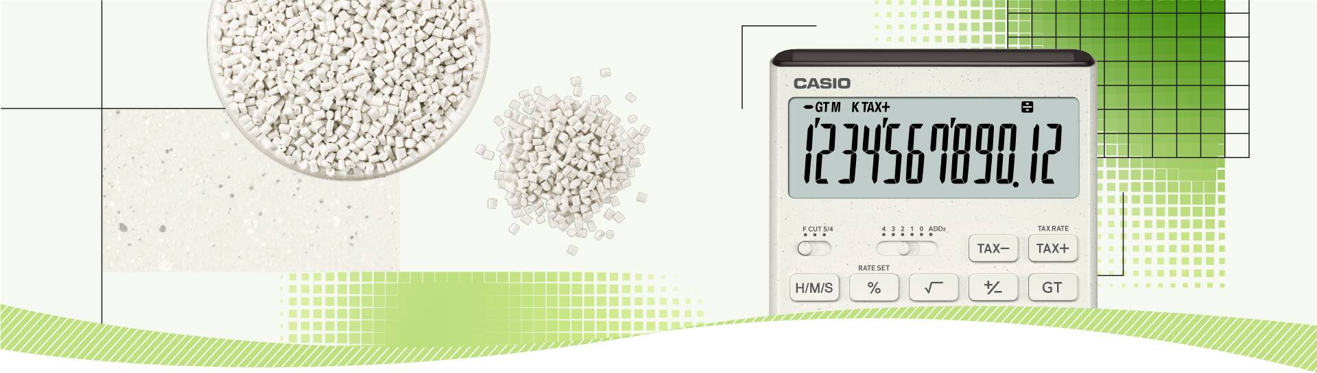 CASIO, hesap makinesi ana gövdelerinde PCR plastik (Tüketici Sonrası Geri Dönüştürülmüş Plastik) kullanımını geliştiriyor.