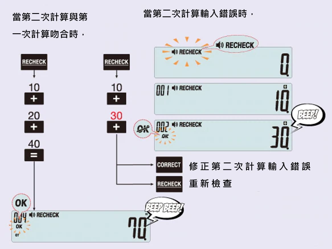 如果使用者進行第二次計算時,若按下錯誤的按鍵,即會發出嗶嗶聲提醒。