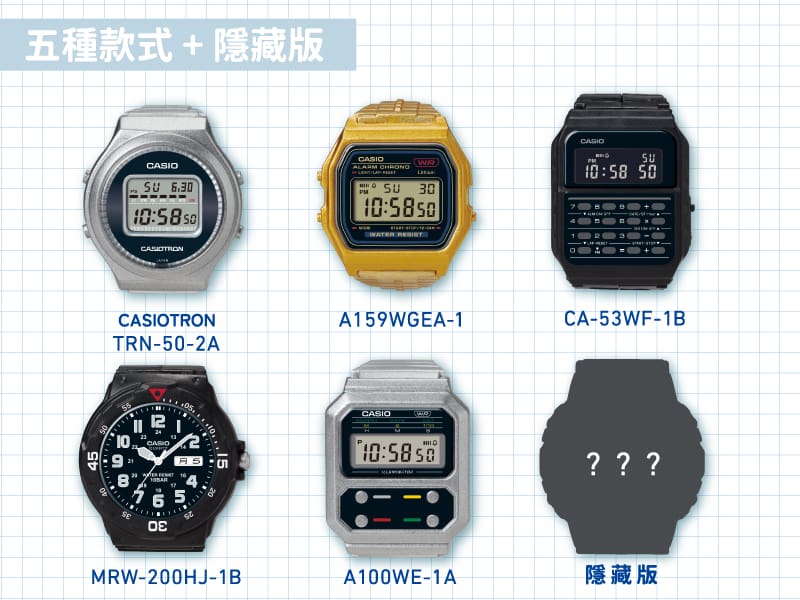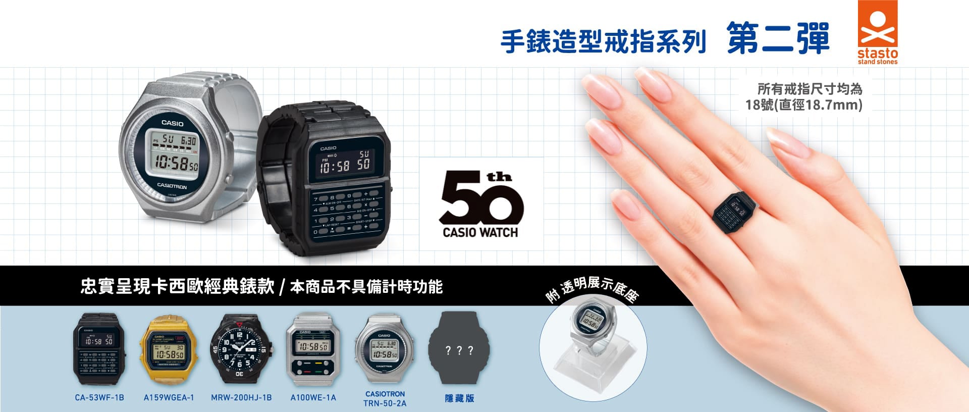 單筆消費金額滿$3,000,即可獲得「CASIO手錶造型戒指」扭蛋機會乙次。精選CASIO具代表性的五種錶款:CA-53WF-1B、A159WGEA-1、MRW-200HJ-1B、A100WE-1A與TRN-50-2A。此外,還有一個驚喜的隱藏版型號。歡迎到全台CASIO直營門市,扭一下試試手氣!