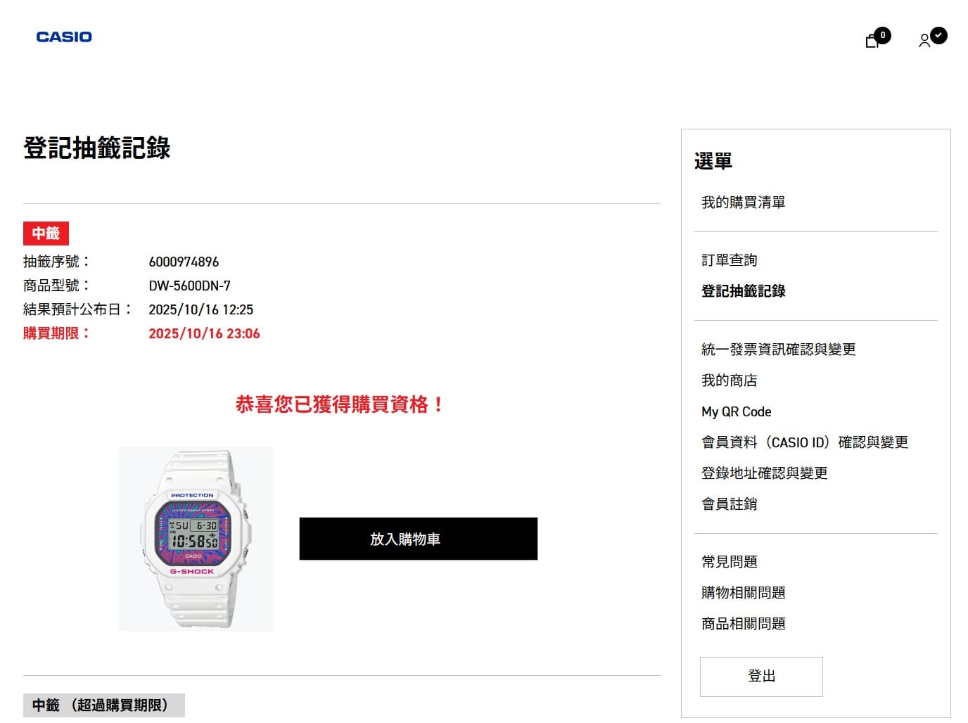 - 中籤者請點擊電子郵件中的「前往購買」按鈕進入我的頁面,將中籤商品放入購物車後購買。