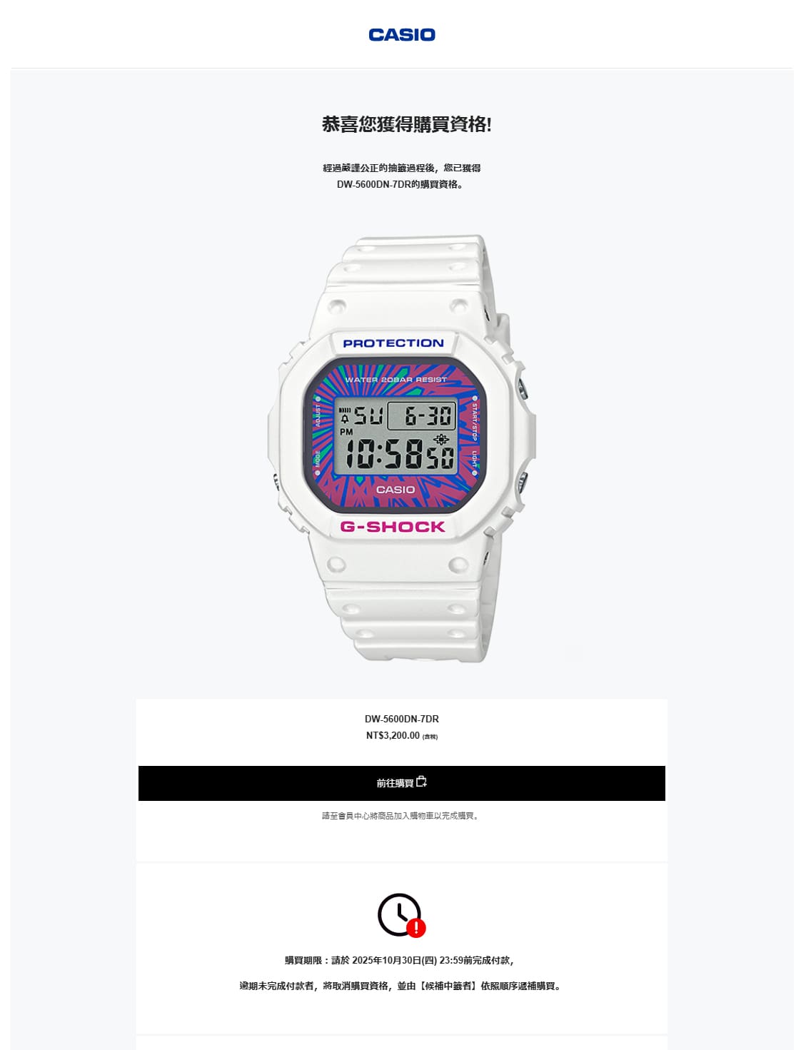- 第二次中籤名單(含候補)將排除 CASIO官方商城與 CASIO直營店第一次抽籤之中籤者與 CASIO直營店候補成功購買者。