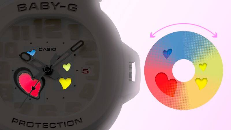BGA-10 錶盤上設計有四個不同比例的心形開口,內建旋轉色輪會隨著時間每日變換色彩