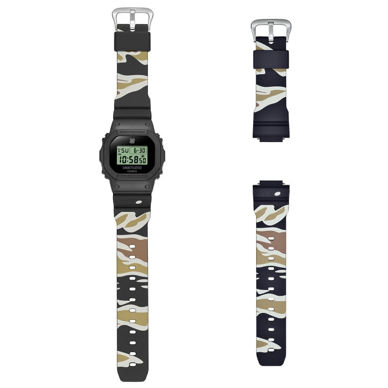 而為滿足潮流愛好者的多元穿搭需求,DWE-5600UD附贈兩條可替換錶帶,皆印有UNDEFEATED標誌性的迷彩圖樣,使用者可依個人風格選擇不透明虎紋迷彩或半透明沙漠迷彩錶帶,打造獨一無二的腕間風格。搭配由UNDEFEATED特別設計,融合黑色與迷彩元素的專屬包裝,完整體現品牌精神與潮流態度。DWE-5600UD不僅融合兩大品牌的經典元素,更進一步彰顯UNDEFEATED在街頭服飾領域的影響力,與G-SHOCK絕對強悍的耐衝擊設計形成完美協同,展現聯名合作的新高度。