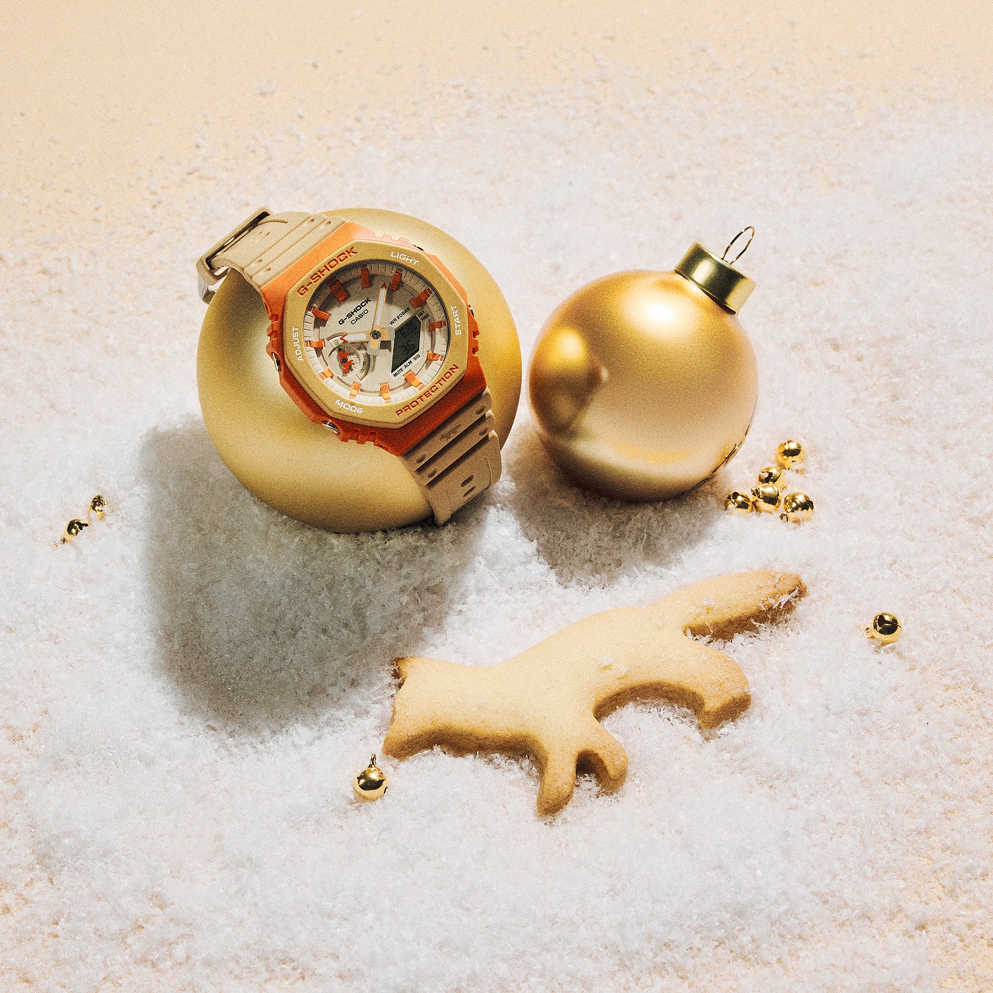 聯名腕錶以深受歡迎的經典八角錶圈與中型尺寸的GA-2110為基礎型號,外觀設計靈感取自奧斯曼建築風格的自然中性配色呈現低調層次,並以醒目的橙色錶圈點綴,營造出宛如巴黎天際線落日餘暉般的璀璨光芒。為巧妙呼應Maison Kitsuné的品牌經典元素,錶盤9點鐘位置的小錶盤指針,以及錶帶與錶殼連接處皆飾有代表性的狐狸圖案。錶帶環與錶殼背面亦印有品牌Logo,並搭配與錶盤迷彩相互呼應的特別包裝設計,以經典而現代的方式詮釋精緻獨到的巴黎美學。