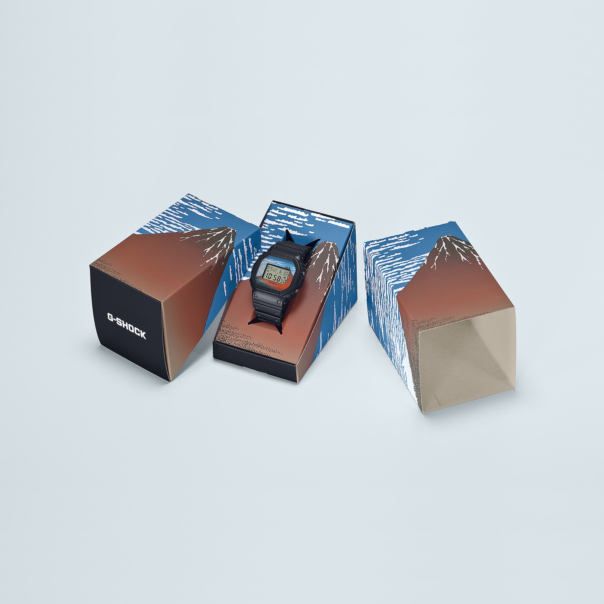 本次選用經典方形數位錶款的5600為基礎型號,並從江戶時代浮世繪大師-葛飾北齋的代表作《富嶽三十六景》中汲取靈感,此系列作品以日本知名「富士山」為主題,從36個角度描繪這座令人敬畏的山岳,不僅成就了葛飾北齋舉世聞名的藝術地位,也開創了浮世繪風景畫的全新類別。本次DW-5600KHK25 採用知名的《神奈川沖浪裏》作品,畫面中呈現巨浪吞噬著漁船,船工們爲了生存而努力抗爭,而DW-5600KHG25 則展現《凱風快晴》之美,記錄著吹拂著輕柔南風的夏日,藍天白雲襯托著赤紅富士山,全新錶款將這兩幅代表性作品巧妙濃縮進錶盤設計中,讓配戴者能夠時時刻刻品味浮世繪之美。此外,為強化其日本特色,除了錶款本身為日本製造外,背蓋還刻有「日本」二字,當按下LED照明時,亦會浮現「日本」字樣,並搭配相對應主題的浮世繪特殊包裝,絕對是哈日族2025年必收的經典主題腕錶。