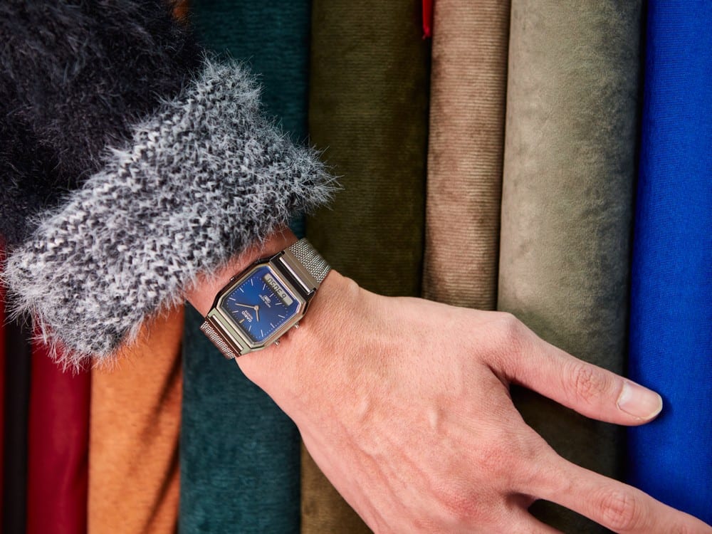 A158比A168更迷你小巧精緻,本次形象照配戴的A158WEM換上細緻的金屬編織網格錶帶,透過專門壓製工法呈現更具立體層次的視覺效果,兼具優雅外型與輕盈舒適的配戴體驗。深綠色與淺灰色的錶盤搭配銀色錶殼,低調中展現個性魅力,讓A158在日常穿搭中自然流露精緻復古風格。