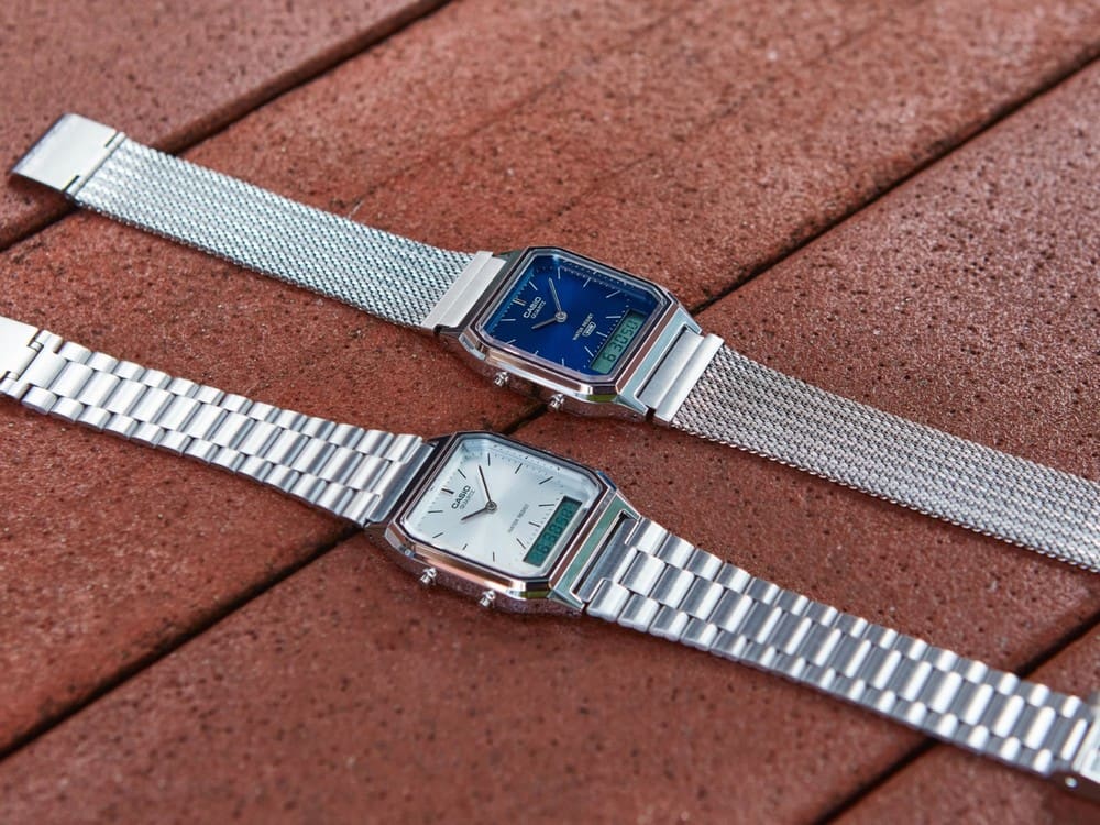 AQ-230採經典方形錶殼設計,結合指針與LCD雙顯設計,在復古外型中保有實用的多樣功能。簡約俐落的輪廓,不論上班或休閒都好搭,低調卻很有風格。不論是搭配實心不鏽鋼或網格錶帶,隨心選擇自由搭配,為日常造型加上恰到好處的復古味。