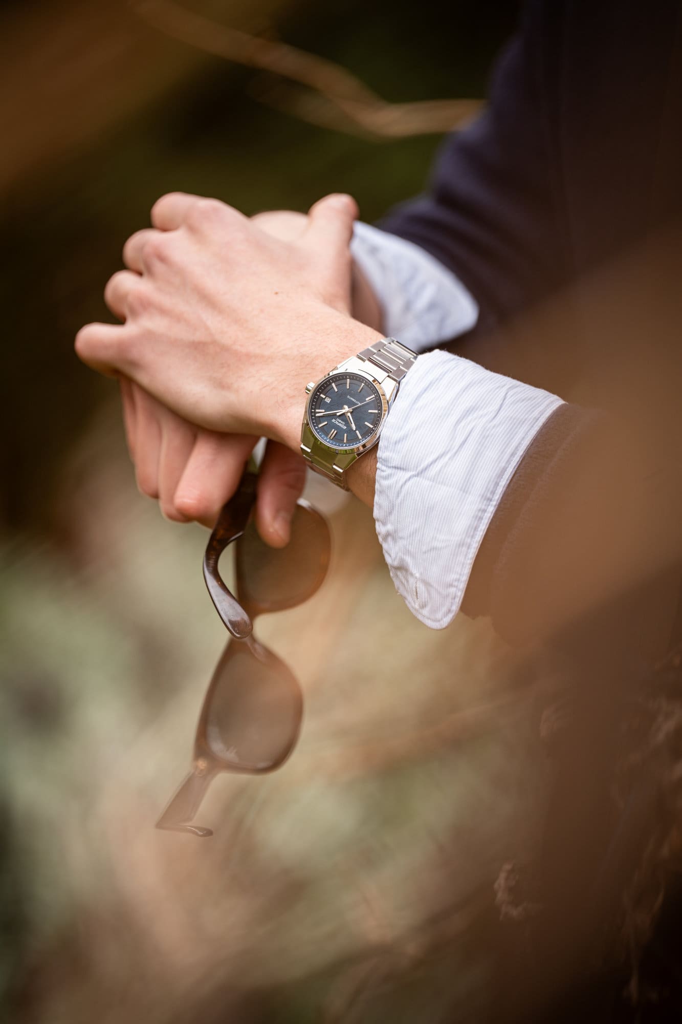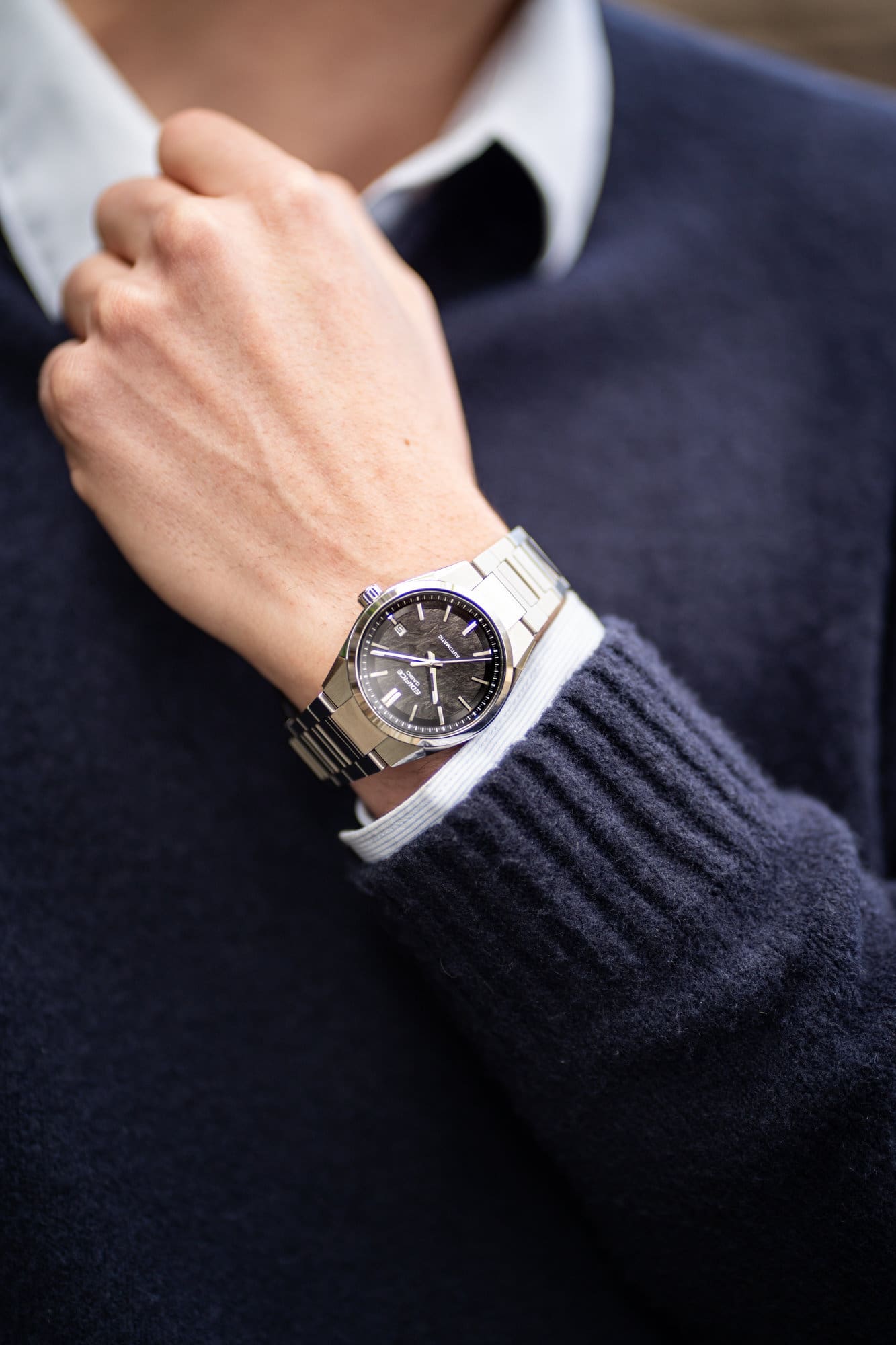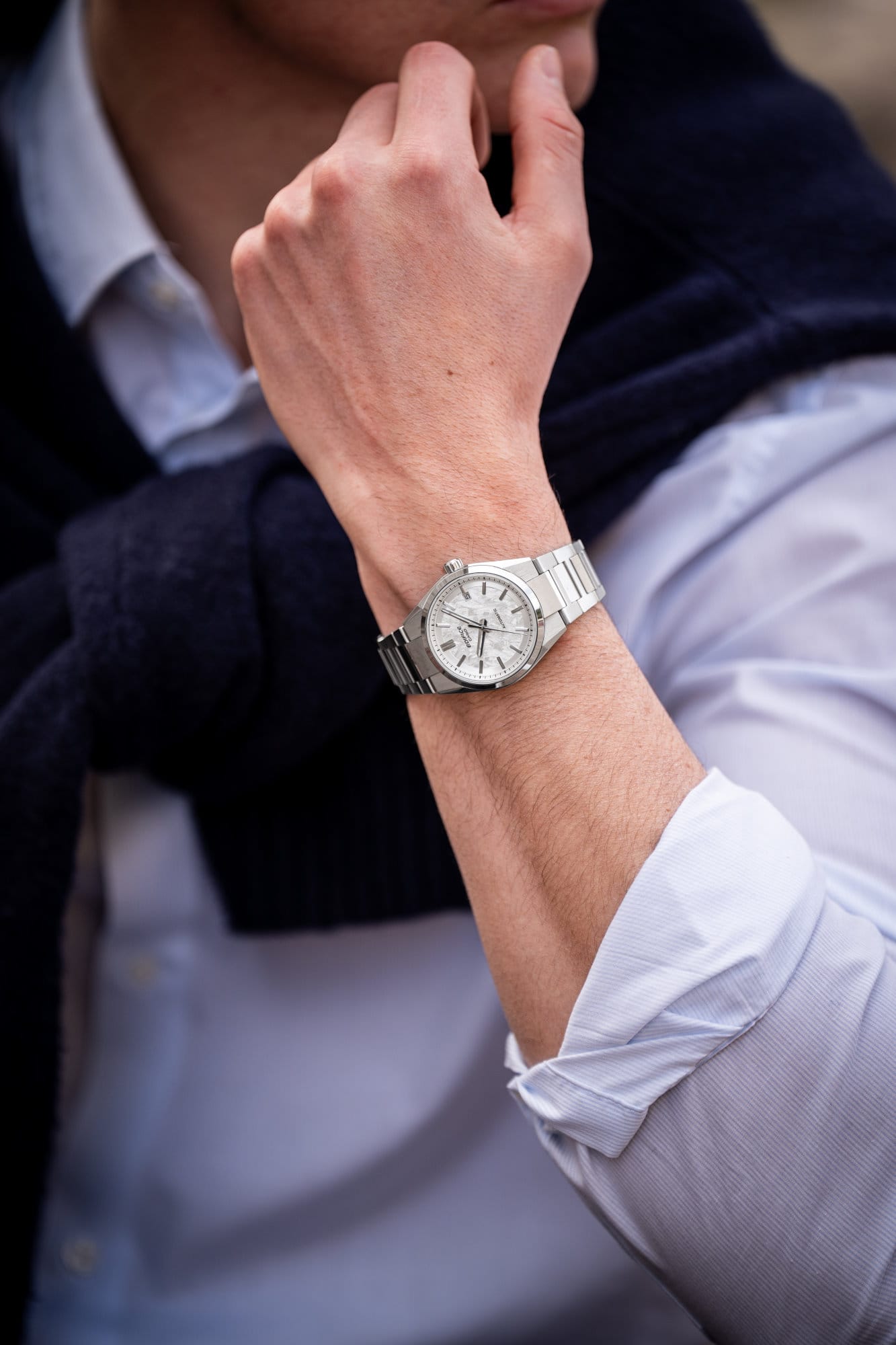 外觀設計上,採用俐落的銀色金屬錶圈搭配實心不鏽鋼H型鍊帶,每個零件皆採獨立的髮絲紋與鏡面拋光處理,呈現層次分明的高級質感,在俐落輪廓中展現細膩光影變化。錶盤提供,黑、藍、白色3款選擇,並以電鑄工藝打造細緻且富有層次的紋理,搭配簡潔的三針與日期顯示設計,低調中展現獨特風格,鏤空造型的時分針、經拋光處理的立體條形時標,以及施以拉絲處理的錶盤外圈等細節,進一步提升整體腕錶的質感與層次。