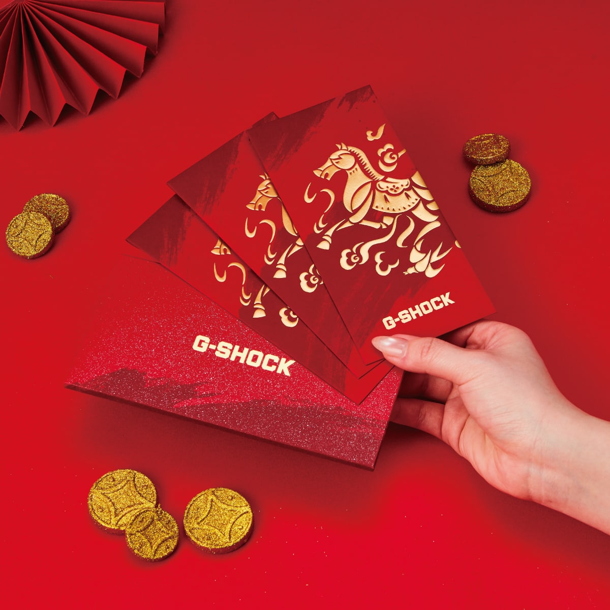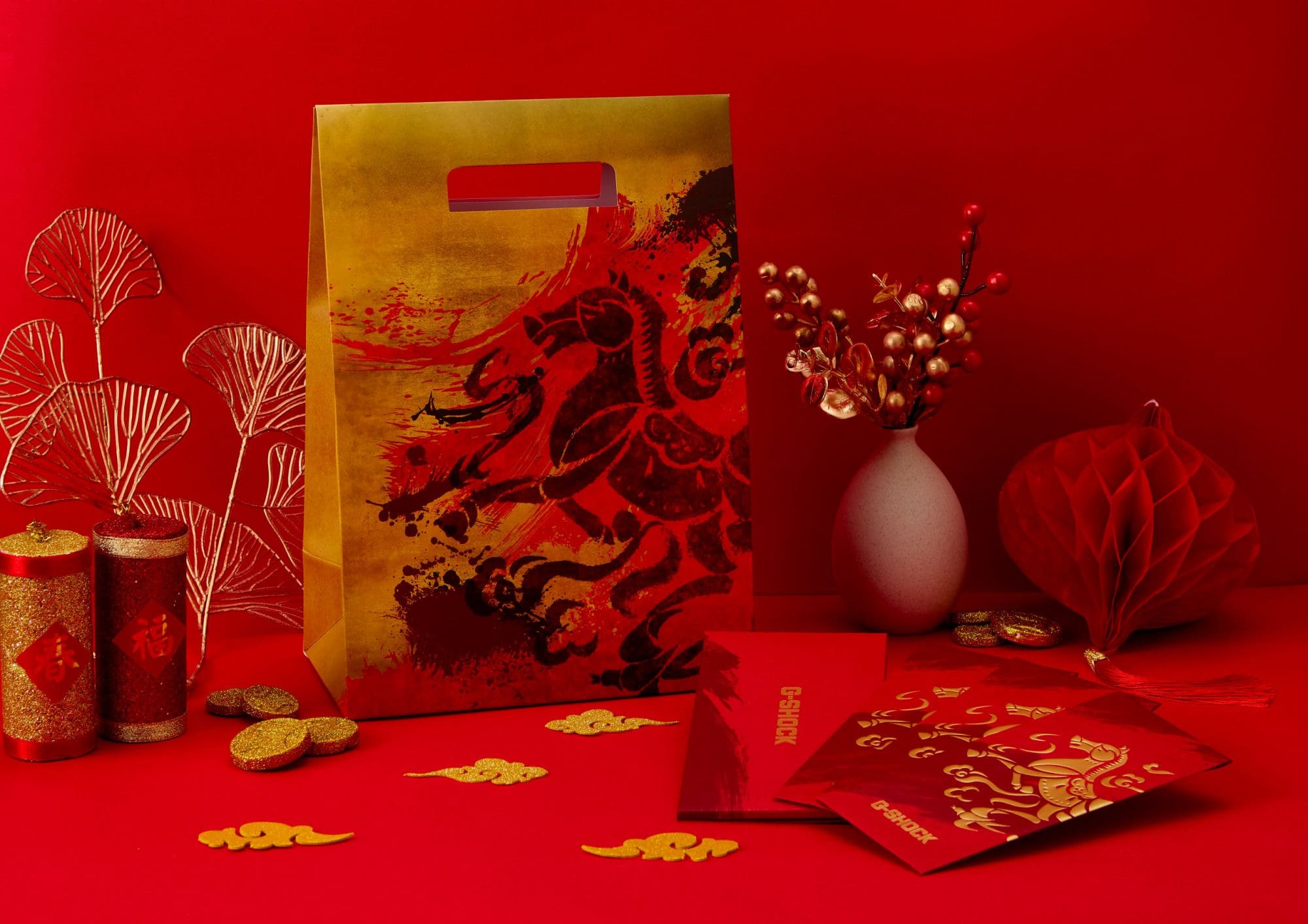 活動期間於CASIO直營門市(包含Outlet)購買福袋更加碼贈送G-SHOCK馬年紅包袋