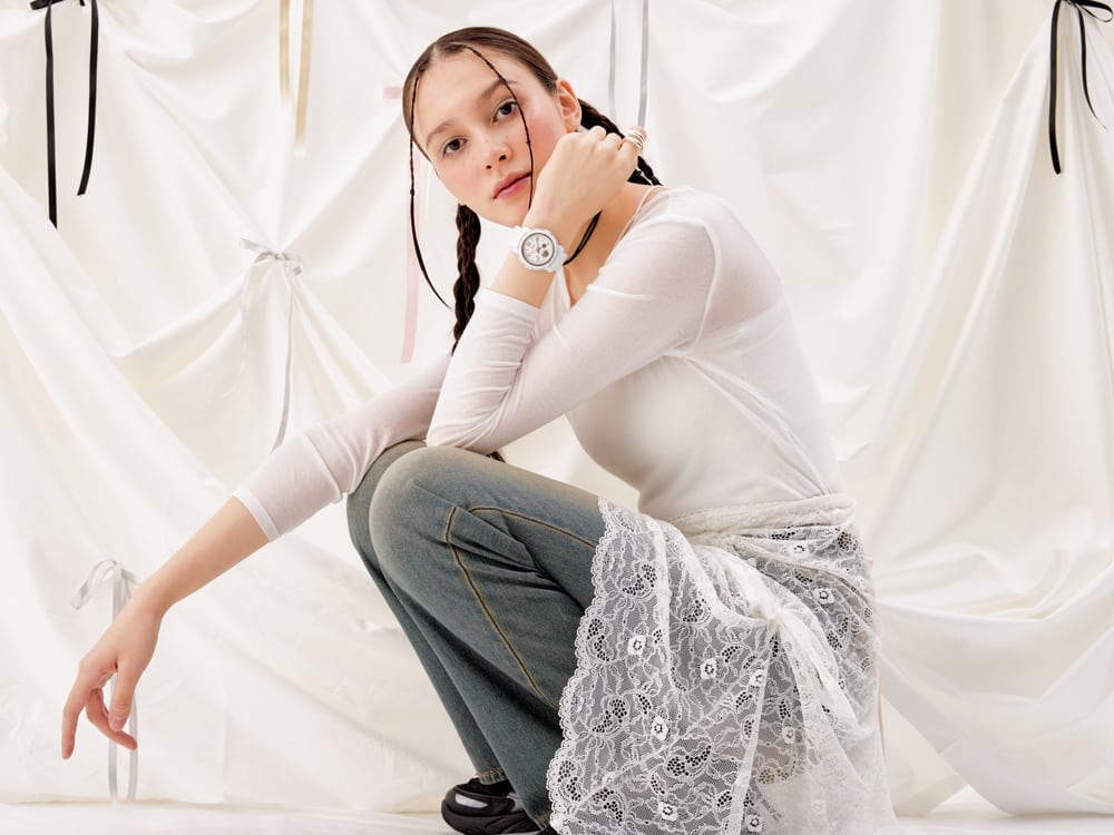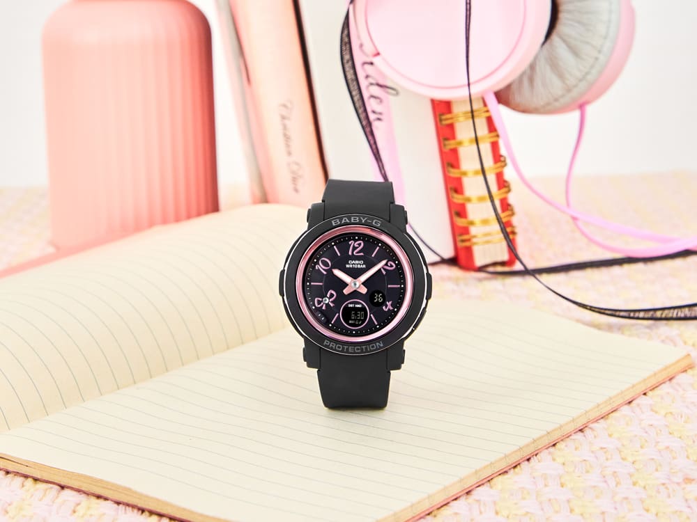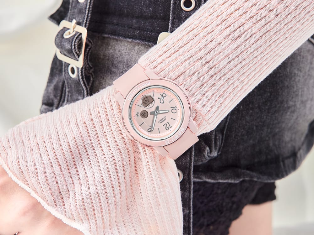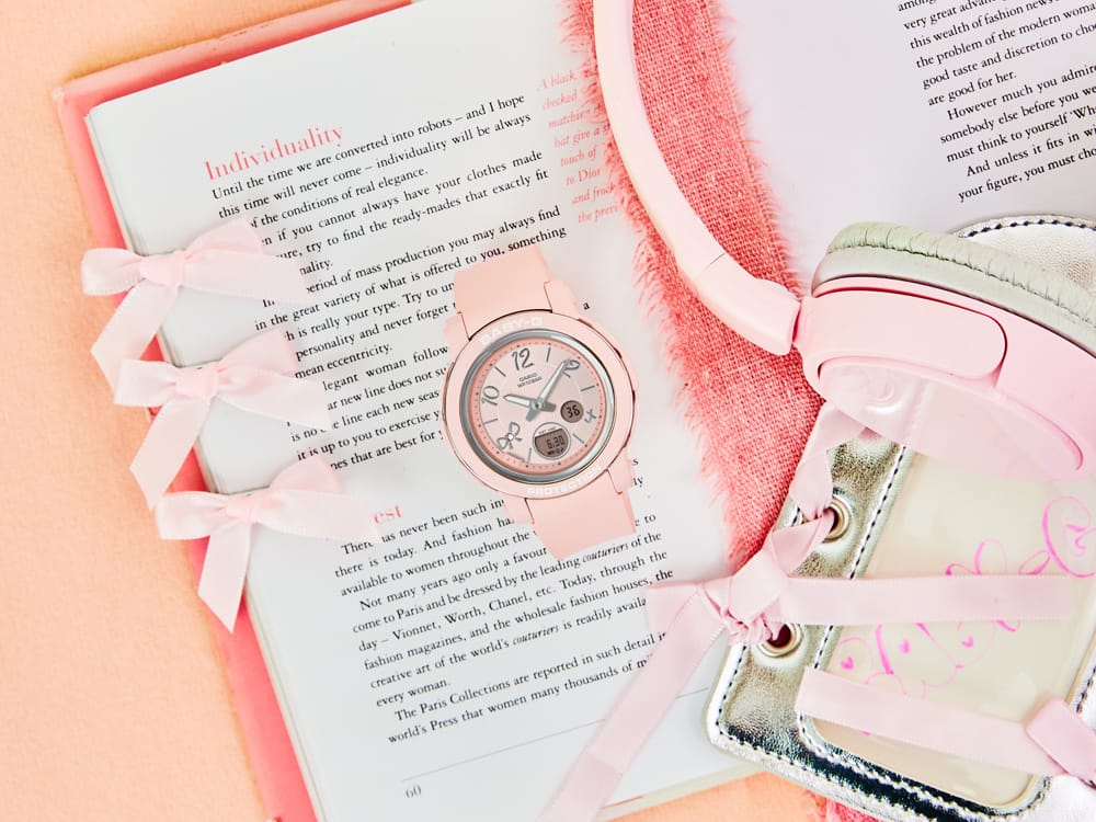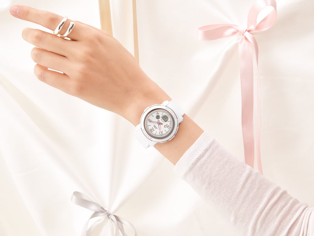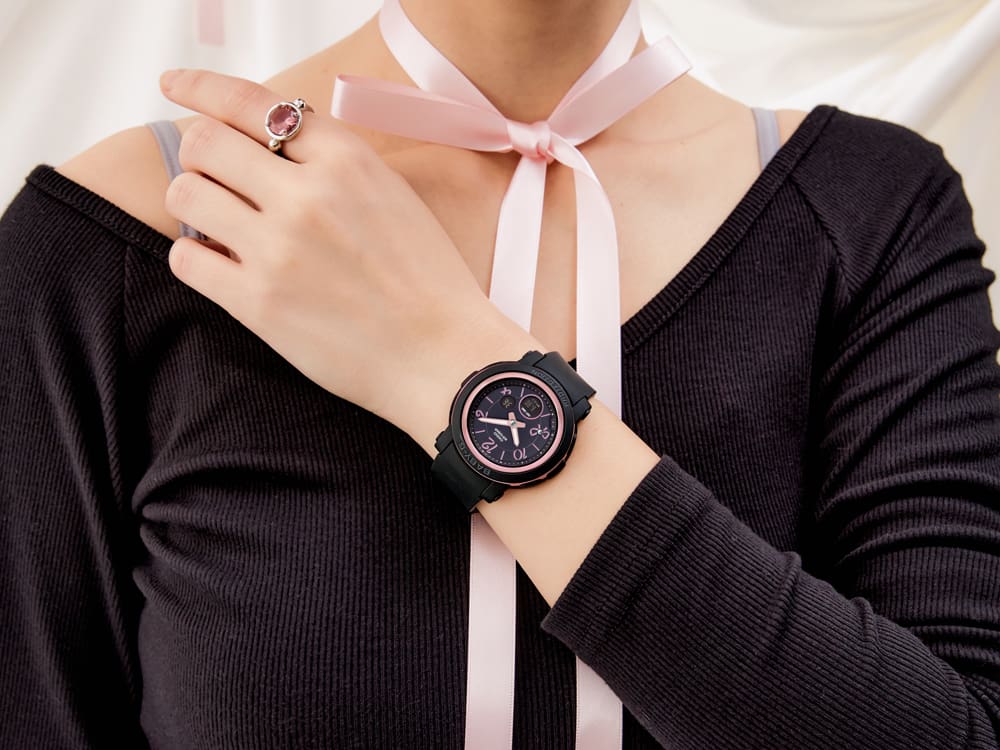 此款式採用女性甜美的緞帶設計。以 BGA-290 為基礎型號,其圓形錶殼與寬面相結合,具有良好的可視性。時標採用以緞帶為靈感的字體設計,為錶款增添一致性和俏皮感。