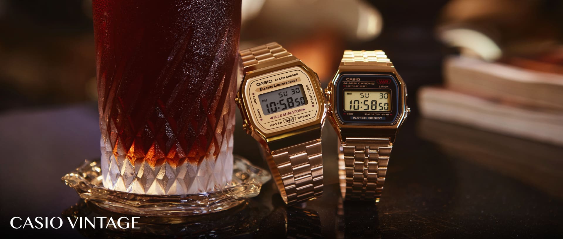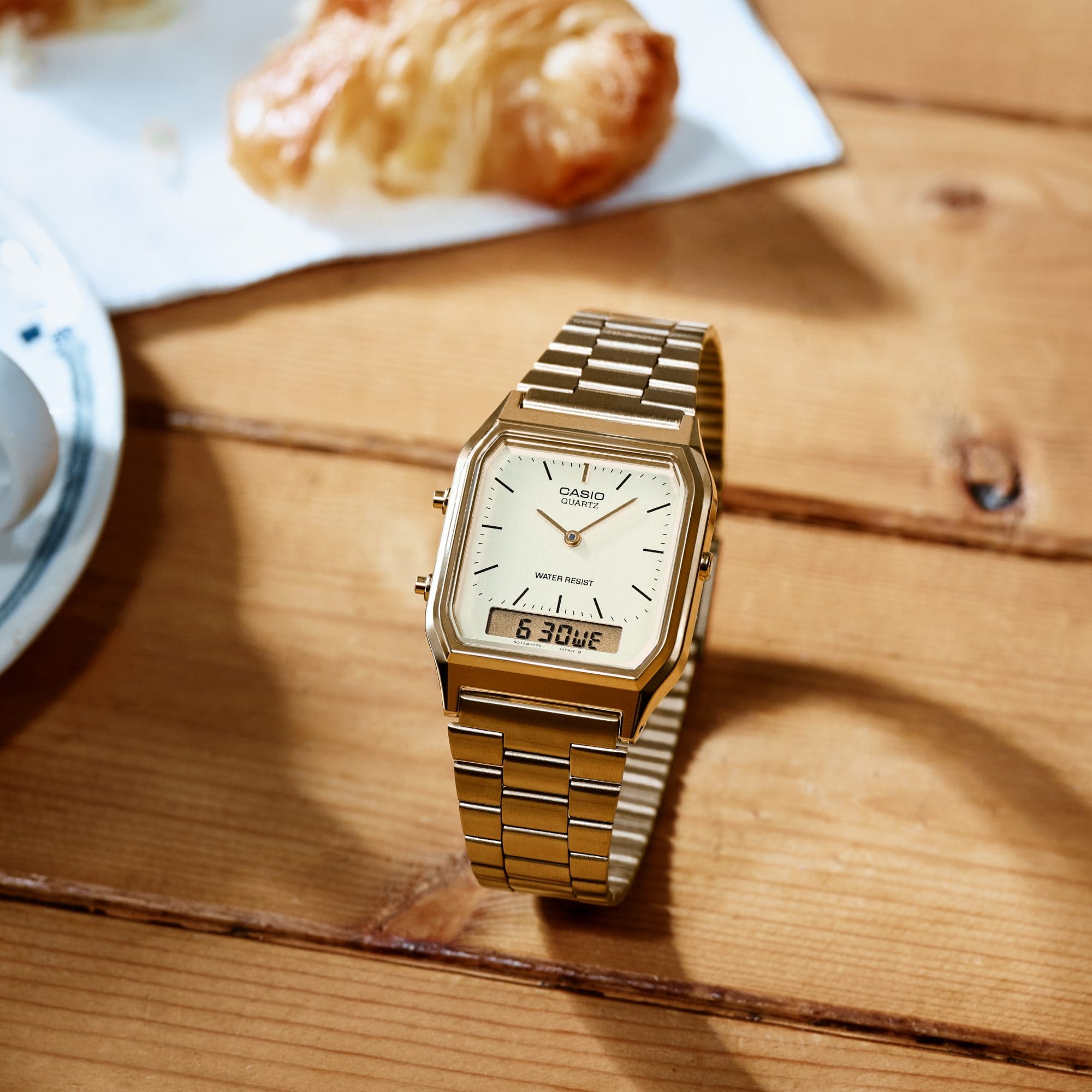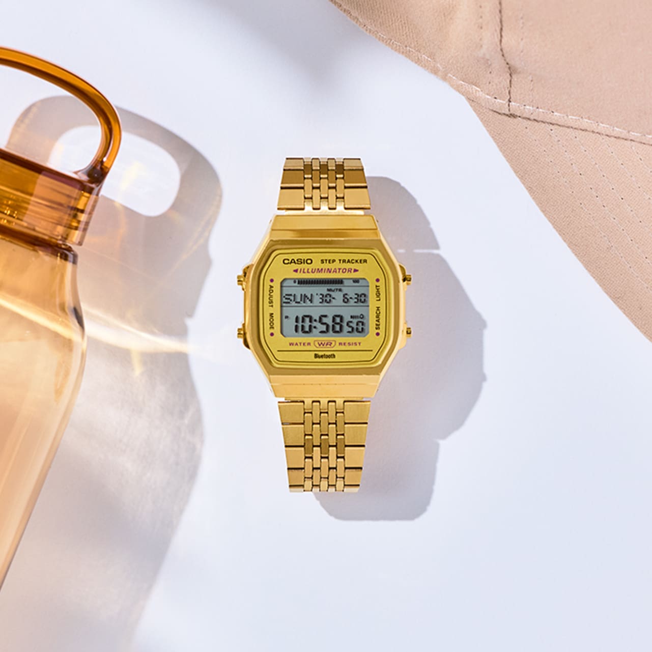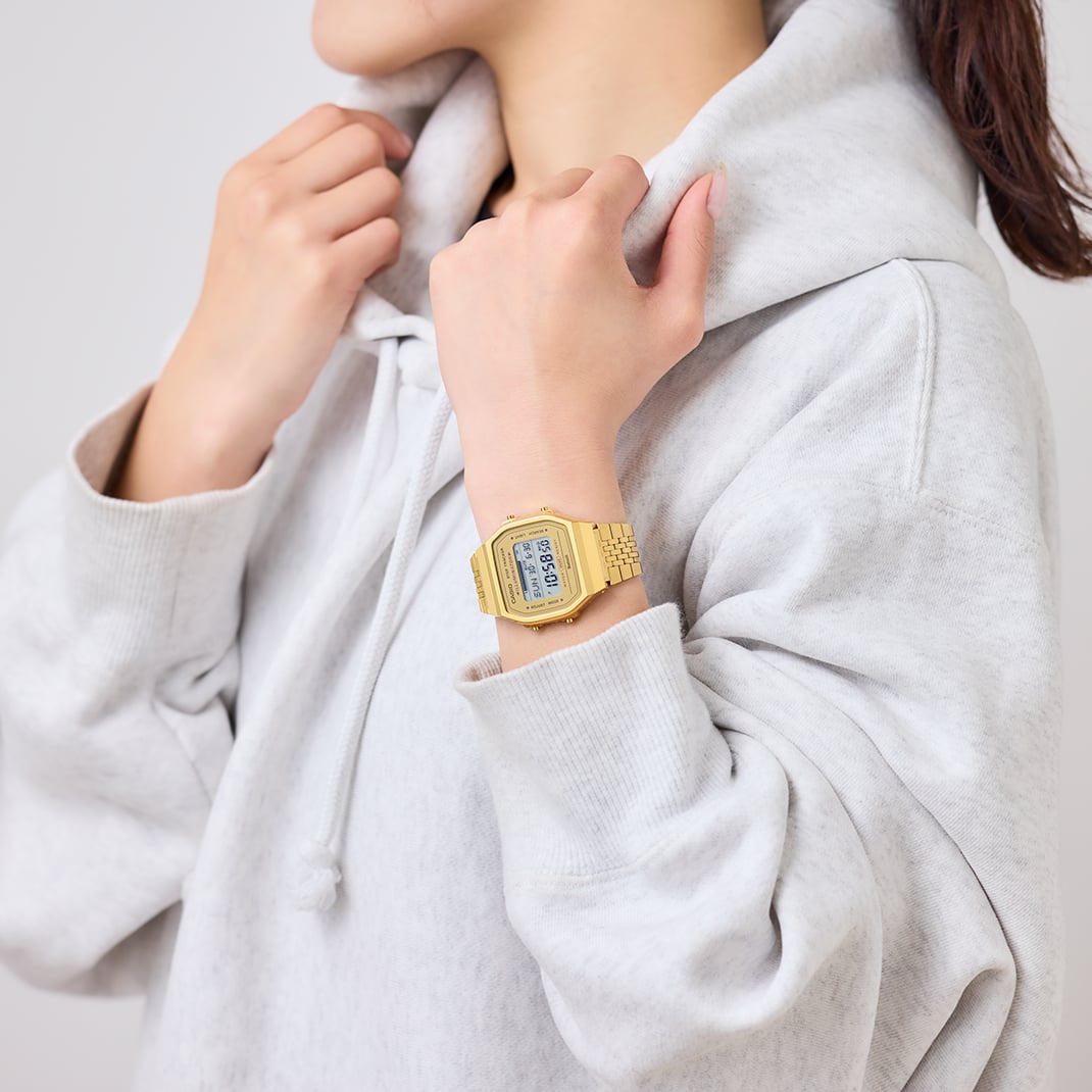 承襲 CASIO VINTAGE 經典數位錶的全金色外型,將復古線條與金屬質感完整保留下來,