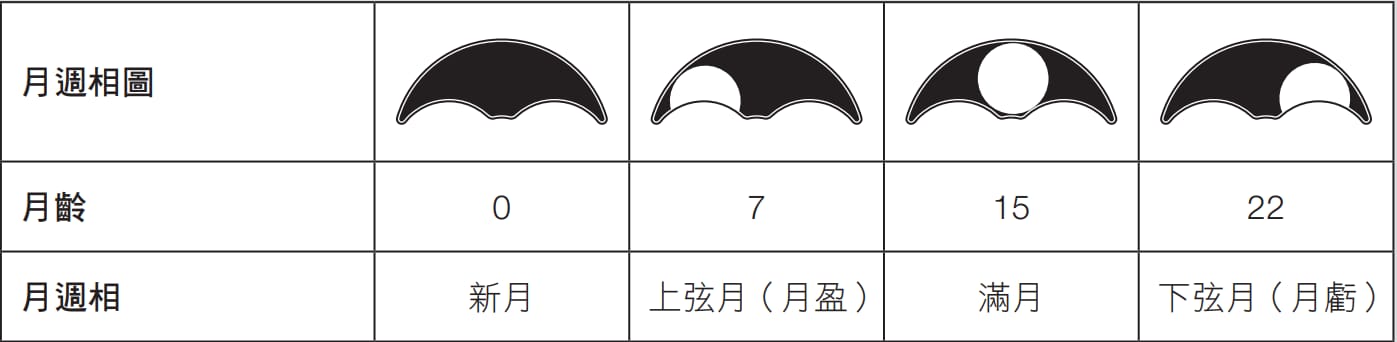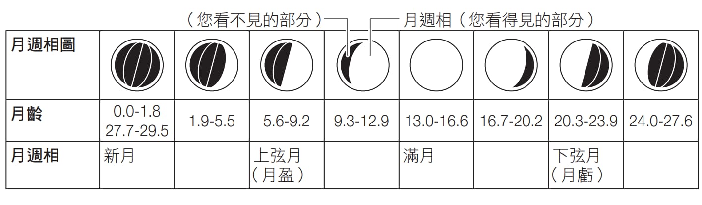 月週相圖表示的是在地球的北半球向南觀看,月球在中午時的形狀。