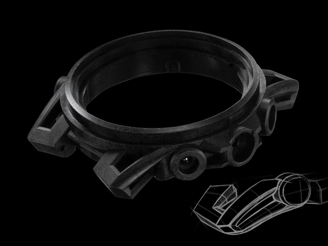 錶耳仿效方程式賽車中使用的懸吊臂系統四臂配置。碳纖維強化樹脂錶殼材質,兼具高強度和輕盈性的雙重優點。錶帶環是由柔軟合成樹脂製成。