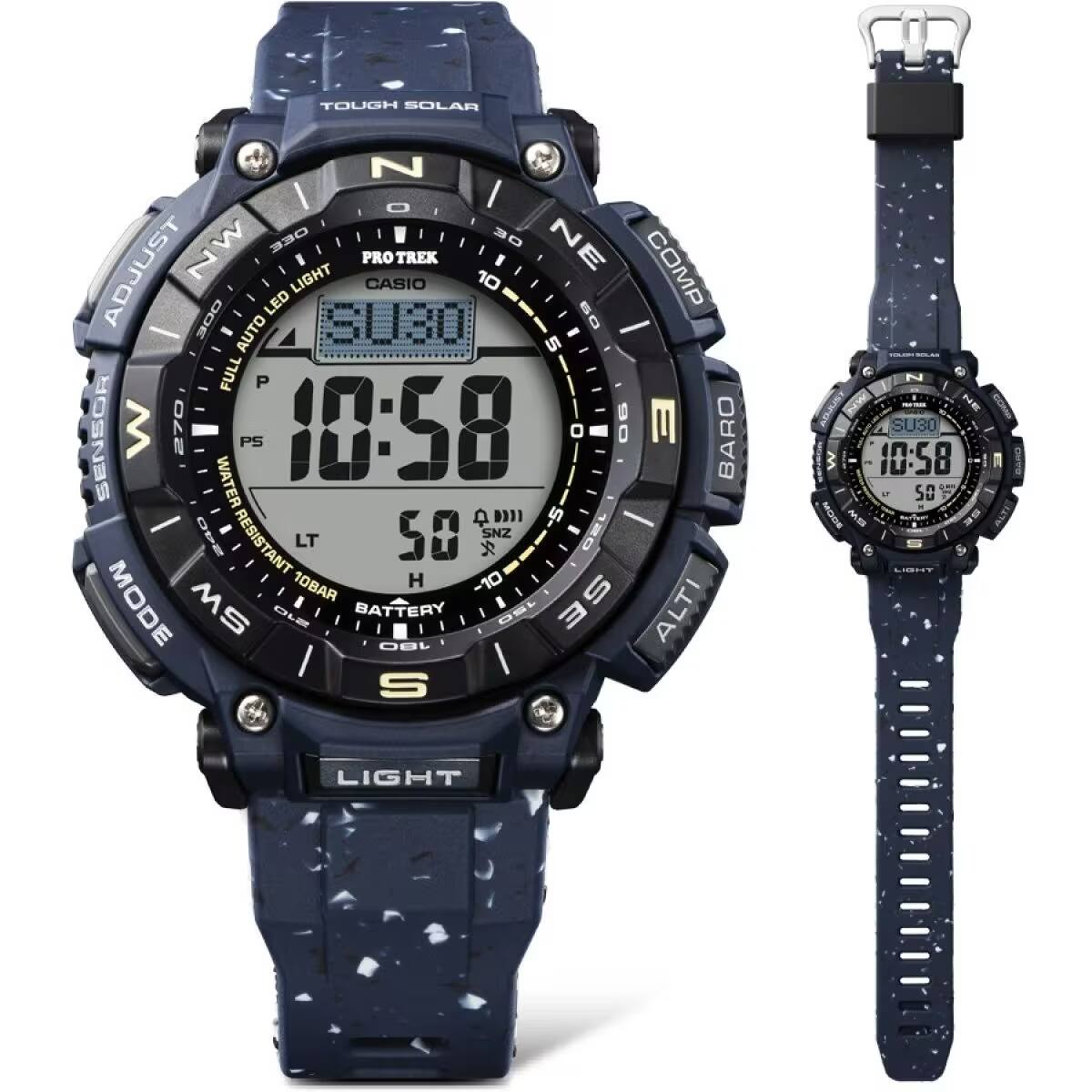 PRG-340搭載雙層LCD設計,錶帶以再生矽膠樹脂材料製成,錶圈、錶殼和背蓋則以生質樹脂製成。此錶款亦配備可追蹤自然環境變化的三重感應器,而Tough Solar太陽能充電系統不僅可運用日光作為電源,甚至可將日光燈等微弱光源轉化為電力。這樣的戶外裝備,不管在製造材料或功能層面都以大自然為核心,讓您與環境保持緊密聯繫,盡情享受自然之美。