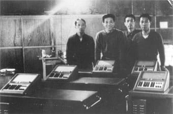 It was back to the drawing board, in search of a new prototype. Around that time, the two younger brothers, Kazuo and Yukio, also joined Kashio Seisakujo. They advanced the development by dividing up the work—Toshio came up with the ideas, Yukio, who had taken mechanical engineering at university, drew the plans, and Tadao and Kazuo did the production. In 1956, they were close to completing a calculator with a continuing multiplication function, and all they had left to do was figure out how to mass-produce it. At this point, Toshio suddenly said he wanted to completely redesign the calculator. The solenoid design with its complicated mechanical structure meant potential difficulties for mass production. Toshio wanted to eliminate the solenoid design and use relays like those employed in the telephone exchange equipment of the time, in order to make a completely electric calculator.