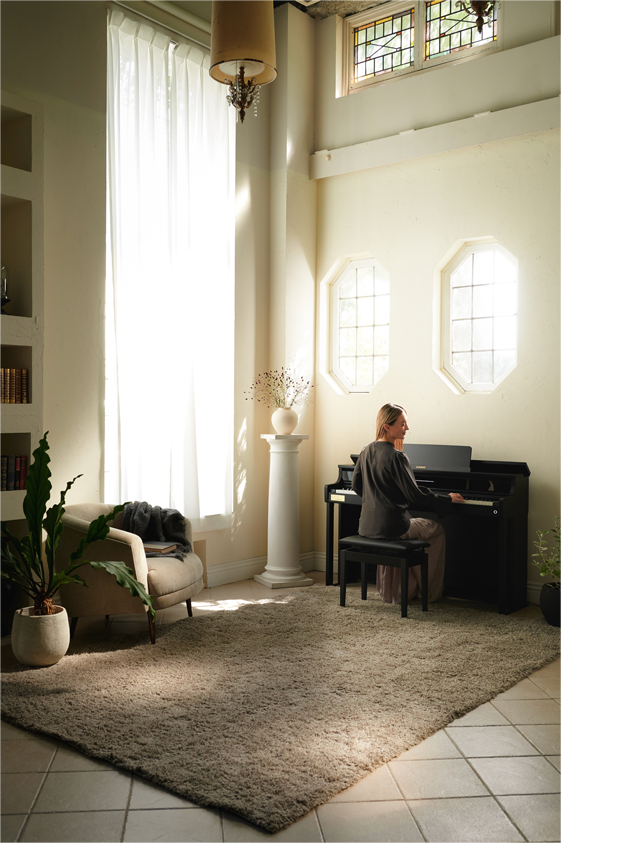 The white keys incorporate a hybrid structure composed of resin and spruce wood, the same material found in grand pianos. With a surface finish that highlights a natural ivory-like texture for the white keys and a texture reminiscent of ebony for the black keys, it faithfully replicates the tactile experience of a grand piano. This not only ensures excellent playability but the luxurious texture also provides the stylish looks of a grand piano.