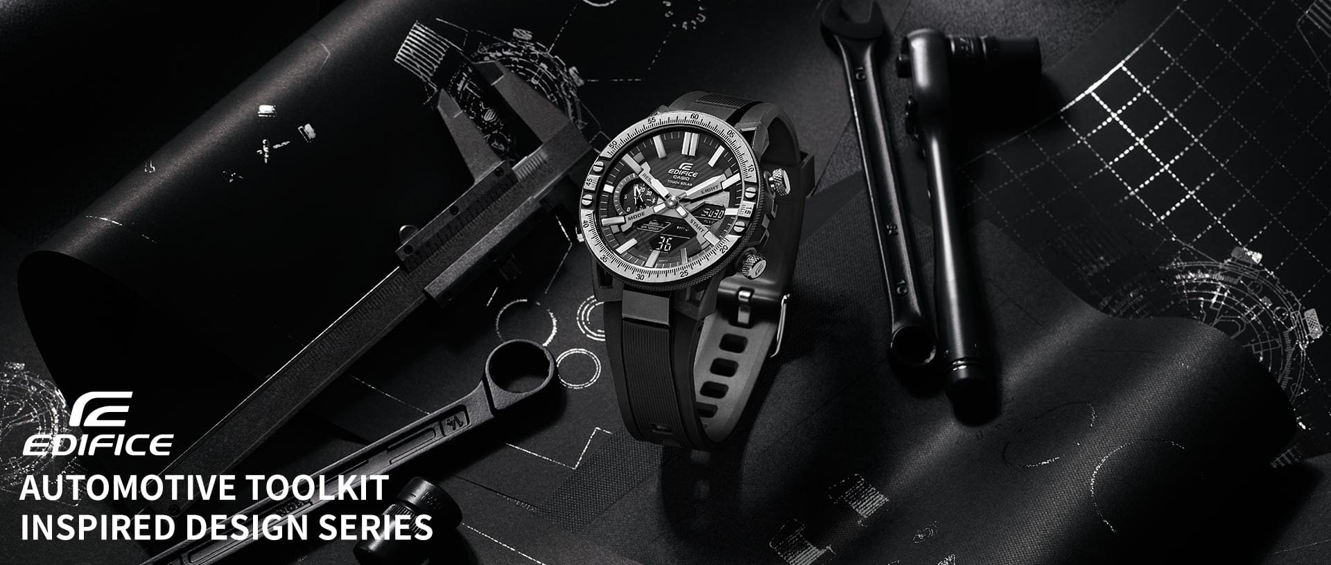 Bộ công cụ chuyên nghiệp tạo thành một phần không thể thiếu trong cuộc sống của những người yêu thích ô tô cung cấp khái niệm thiết kế cho dòng sản phẩm mới đặc biệt này. Các quá trình phủ và đánh bóng riêng được áp dụng cho gờ kim loại và việc sử dụng màu đen và bạc tương phản đem đến sự ấn tượng về độ bền chắc cho chiếc đồng hồ. Với thiết kế vừa táo bạo vừa phức tạp, kết hợp với các vạch đo và đường khía chi tiết tinh xảo, những chiếc đồng hồ toát lên sự nhạy cảm của các công cụ và dụng cụ chuyên dụng đã truyền cảm hứng cho chúng. Một dòng sản phẩm xứng đáng với tên EDIFICE, được thiết kế đặc biệt phù hợp với phong cách sống của những người đam mê ô tô.