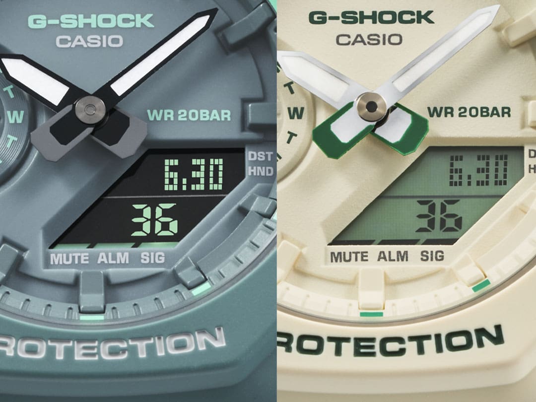 Màn hình LCD trên mặt số cũng có các điểm nhấn màu xanh lá kết hợp với màu bên ngoài đồng hồ. Màn hình LCD xoay ngược hiển thị màu xanh lá trên nền đen, trong khi màn hình LCD thông thường hiển thị màu đen trên nền xanh lá. Màu sắc kết hợp hài hòa trên mặt đồng hồ tạo nên điểm nhấn sành điệu.