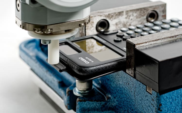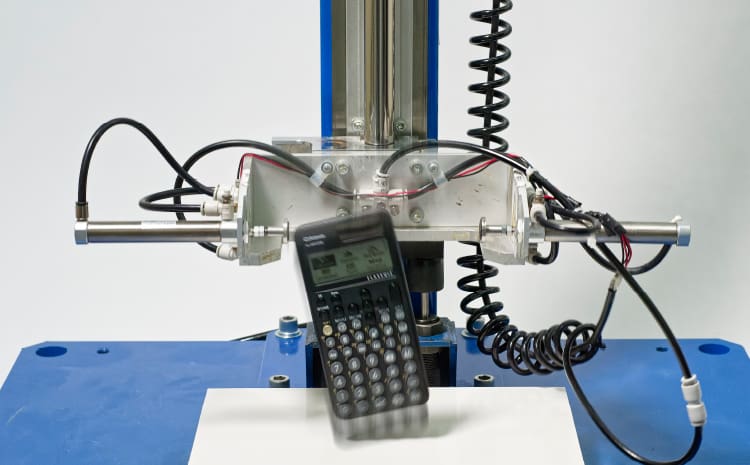 In this test, a protective hard cover is attached to the calculator, which is then secured to a specialized testing apparatus. A robot is used to repeatedly detach and reattach the hard cover. The calculator and cover are then examined for the presence of any breaks or cracks at the places where they are secured.