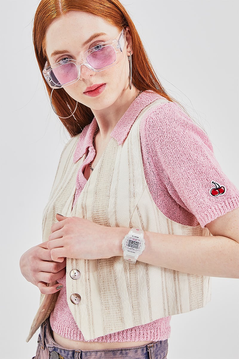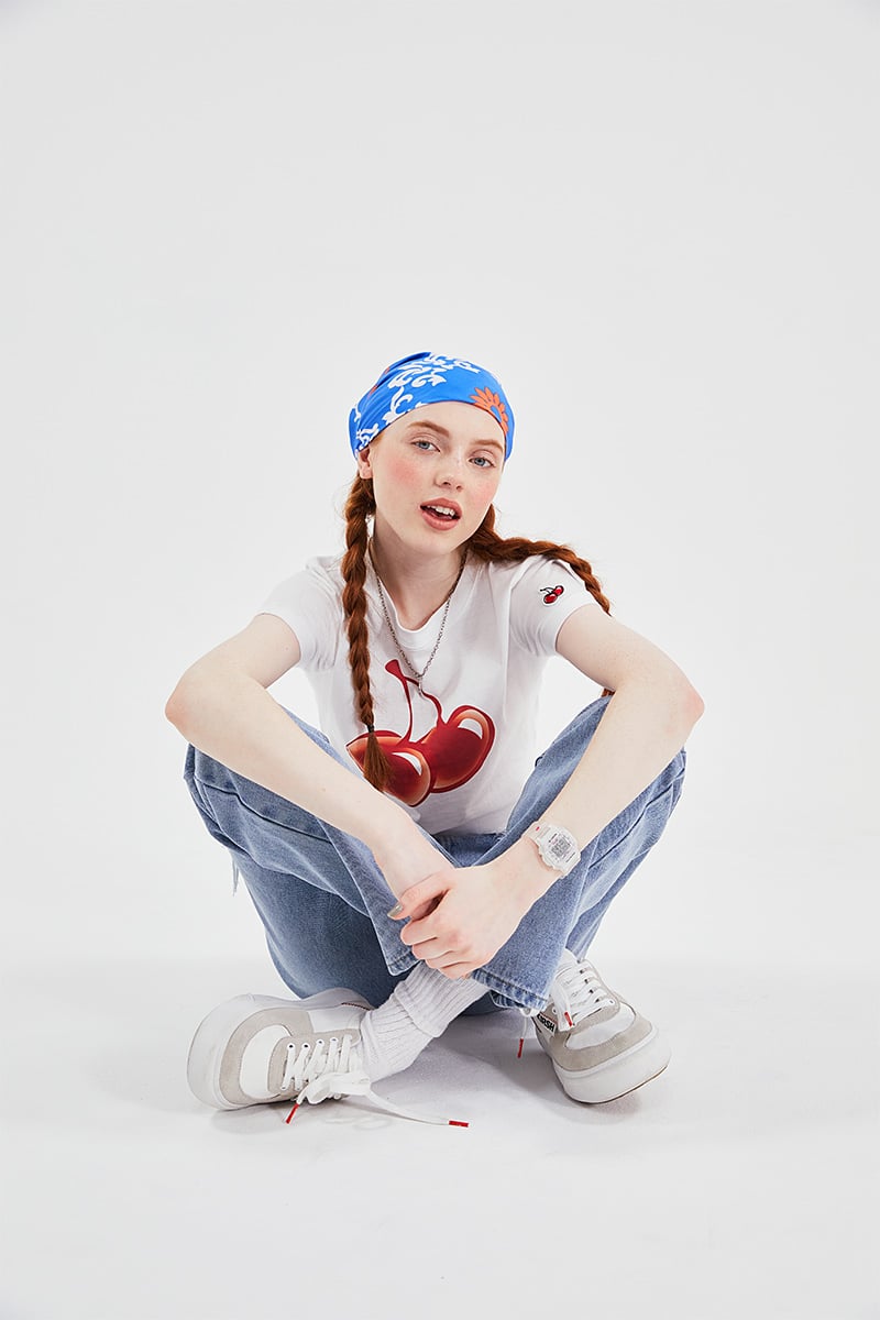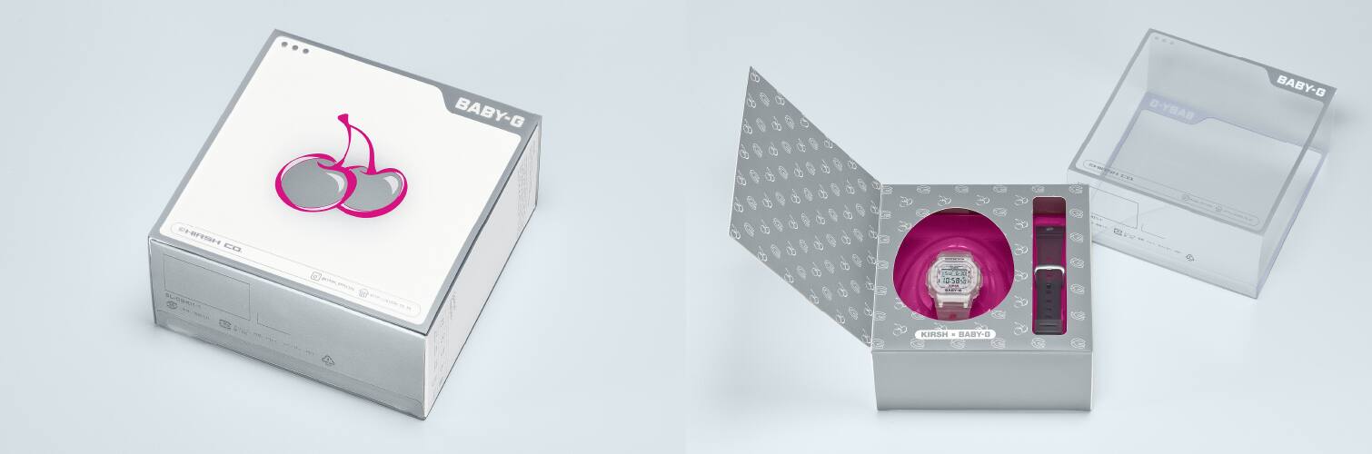 Our retrofuturistic design uses translucent materials that echo the 1990s. The watch itself is sprinkled with the trademark cherries of the KIRSH® brand. The product comes with two easily interchangeable bands, also made of translucent materials. This collaborative masterpiece is a must-have for fans of the sweet and innocent styles of BABY-G and KIRSH®.
