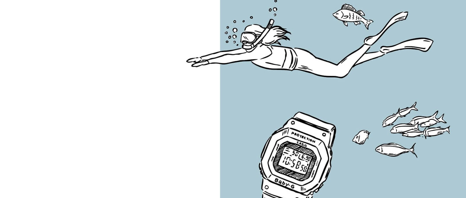 Every BABY-G is built for at least 100-meter water resistance. Wear it without worries when working around water, swimming or snorkeling.*