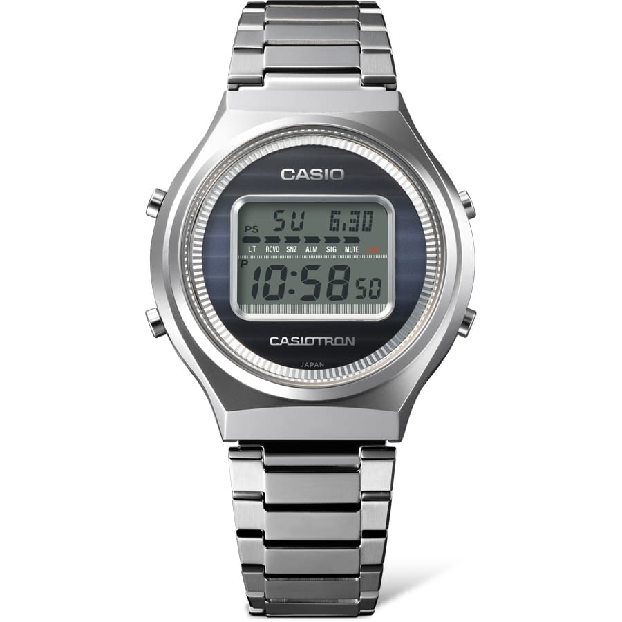A close look at the design of this watch from 50 years in the past reveals careful consideration of factors including ease of the time’s readability and textural appeal. Separate finishes are applied to the surfaces of the case and band, and the dial and grooved panel cover are crafted with luxe quality. Now, as then, the wristwatch continues to function as a practical device as well as an accessory adding fashion flair. The original design is meticulously reproduced with a dark blue dial, Casiotron logo, and many other details.